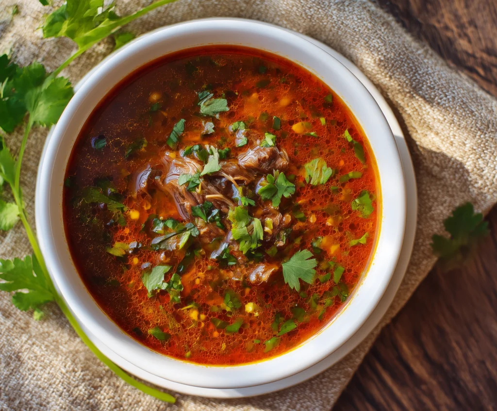 Authentic birria soup is rich flavorful and deeply satisfying. Slow cooked meat and warm spices create a comforting dish that brings traditional flavor to the table.