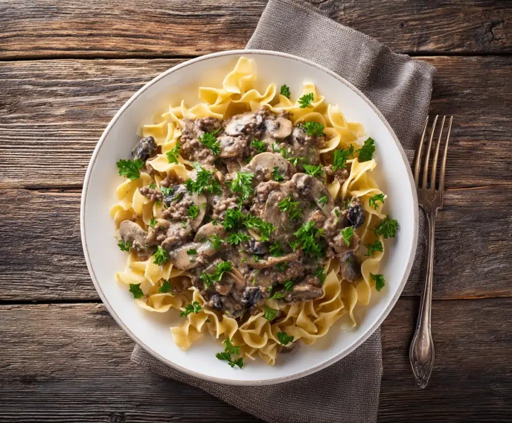 kcalThis Simple and Delicious Ground Beef Stroganoff delivers hearty comfort in every bite. Tender ground beef simmers in a creamy mushroom sauce, served over soft noodles for a cozy family meal that feels homemade and satisfying. Easy enough for busy nights yet impressive enough to serve guests.