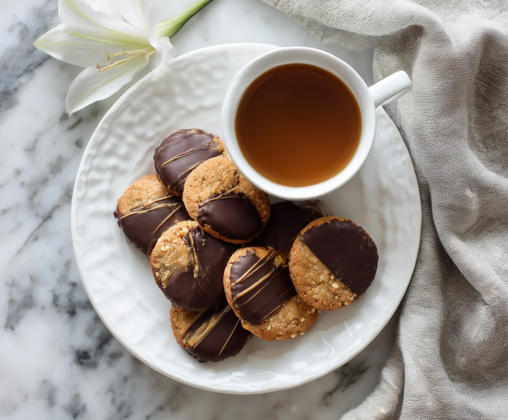 White Lily Chocolate Dipped Peanut Butter Cookies combine rich peanut butter flavor with a smooth chocolate coating. These cookies are soft, chewy, and visually appealing, making them perfect for gifting, sharing, or enjoying with tea or coffee.
